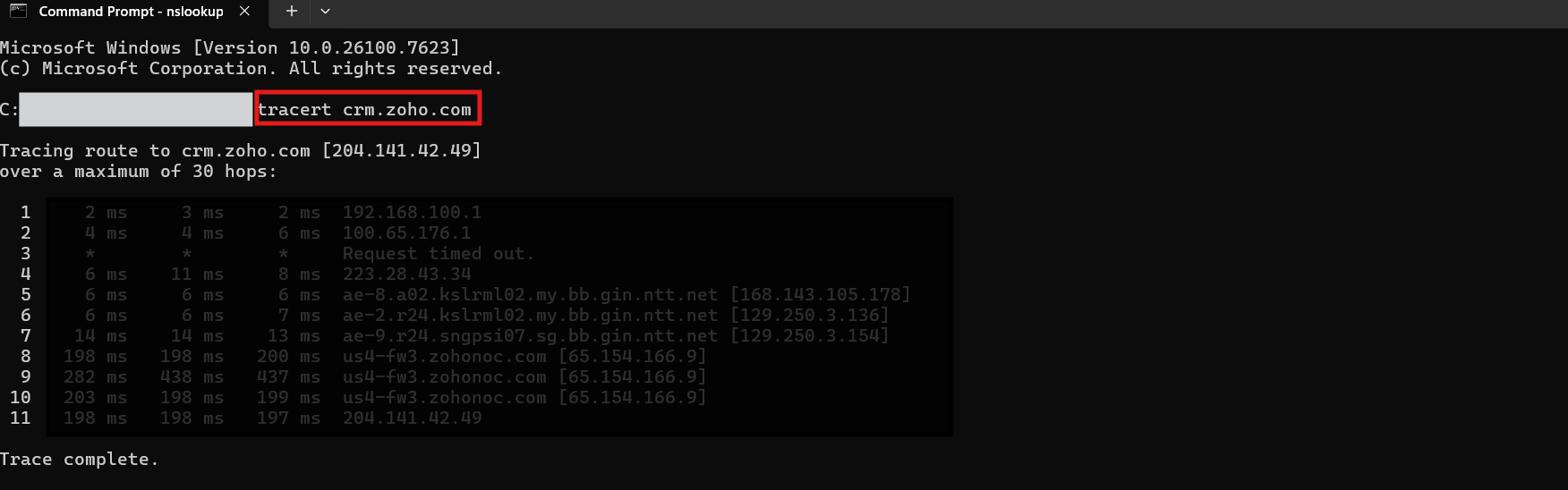- Traceroute results to the Zoho service URL (minimum 2 Zoho services) you are accessing. Example: crm.zoho.com, desk.zoho.com, or your company specific Zoho URL